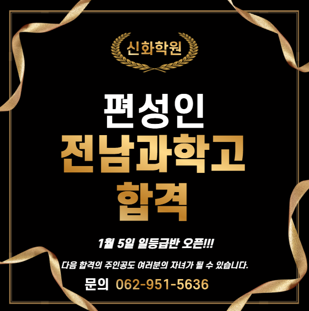 전교 1등, 그리고 전남과학고 합격. 이 결과 뒤에는 우연이 아닌 구조적인 학습 시스템이 있습니다. 광주 하남지구 전과목 종합학원 신화학원은 단순히 많은 과목을 가르치는 학원이 아니라, ‘결과가 나올 수밖에 없는 환경’ 을 만드는 학원입니다. ⭐ 신화학원만의 확실한 강점 1. 전 과목 전문 강사진 시스템 국어 · 영어 · 수학 · 사회 · 과학 각 과목을 전공·전문으로 연구한 강사진이 직접 수업을 진행합니다. 단순 문제풀이 위주의 수업이 아니라 개념 → 심화 → 문제 해결력으로 이어지는 구조적인 학습 설계를 통해 실력을 완성합니다. 2. 입시 컨설팅 전문가 상주 학생마다 목표도, 현재 위치도 다릅니다. 신화학원은 이를 고려해 맞....... <img src="https://blogthumb.pstatic.net/MjAyNTEyMThfMTM4/MDAxNzY2MDQyNTEzMTk5.tuzziDqCp701BFlzZu6kmdHVxfVjXsA25kgjFFco6Gkg.uuCyJWfmJN1BYzvCzL7J3uwkWTjdM-YgXkw9lZxjFEcg.PNG/image.png?type=s3" />