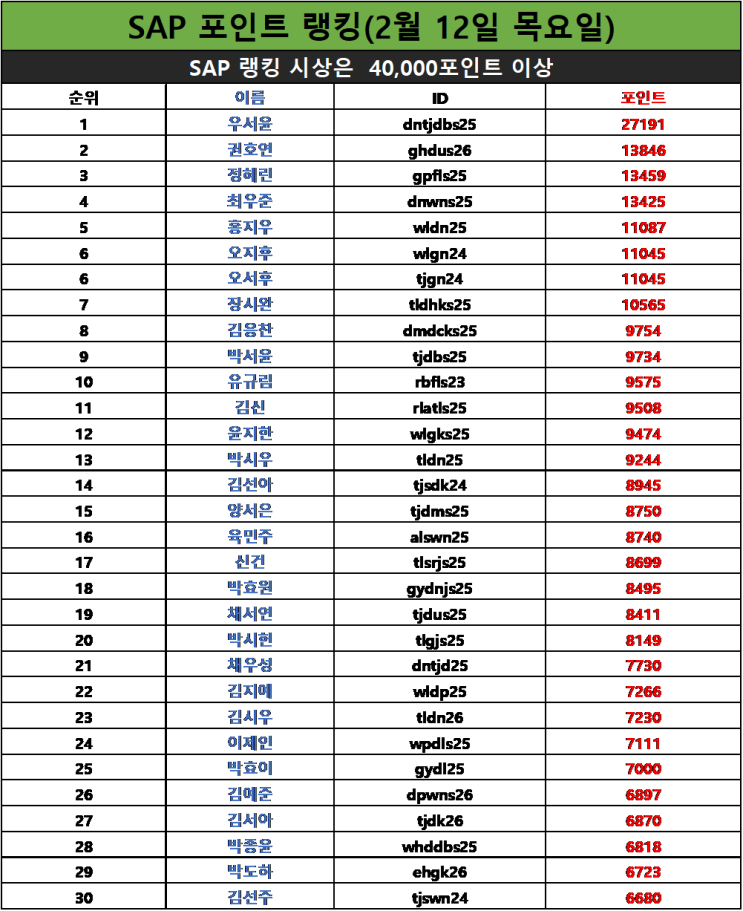 안녕하세요, 더클래스어학원입니다. 2025년 02월 12일 기준 SAP 포인트 랭킹 순위표입니다. <img src="https://blogthumb.pstatic.net/MjAyNjAyMTJfMjM0/MDAxNzcwODc1NjcxOTY3._MPm3u6njksRwljGl5EkGMDdRn6_VzoTJH7HL1DYnuUg.B3cXiRY3Z-IxSZTmr2JIK4teleD0Vue29vXp-5NfbUog.PNG/image.png?type=s3" />