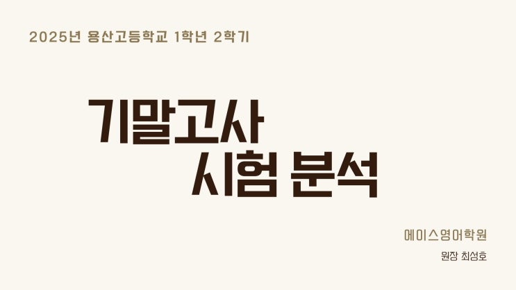 안녕하세요! 그 동안 기말고사 시험기간으로 중고등부 모든 학생들이 쉼없이 공부하고 달려왔습니다. 에이스영어학원도 하루하루 바쁘고 치열하게 수업하고 준비하느라 포스팅이 조금 늦어졌네요 (흑흑) 그래서 오랜만에 준비한 포스팅인 만큼 정말 유용하고 알찬 내용으로 준비해왔습니다!! 2025년 대전 용산고등학교 1학년 2학기 기말고사 시험분석 현재 에이스영어학원에서 직접 고등부 강의를 하는 우리 원장님의 시험분석을 가지고 왔습니다! 이번 시험 어땠는지 한번 볼까요? 이번 시험의 문항구성 비율입니다. 부교재와 모의고사가 대부분의 비율을 차지하고 있습니다. 문제 유형은 10가지로 다양하게 나왔습니다. 문제 유형별 문항, 출제....... <img src="https://blogthumb.pstatic.net/MjAyNTEyMTlfMTcy/MDAxNzY2MTM0MzU2NDU5.mwePUXmtbyzrI8SzJkDQ--xvfK9FlpWLPNyExks8EQ8g.EOlDIhMAGUvR4C30G_G9xtp4dgF11PCj30hw0I9k2NQg.JPEG/1.jpg?type=s3" />
