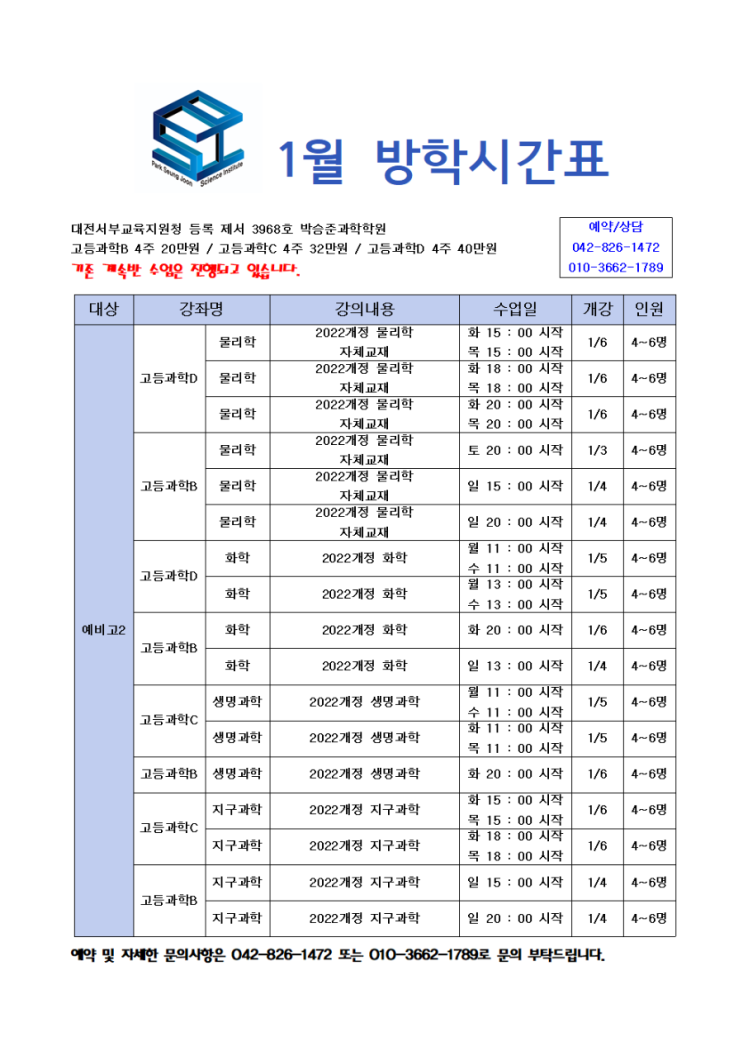 2026년 1월 개강 하는 방학시간표 입니다 _신청 및 자세한 문의는 042-826-1472 또는 010-3662-1789 연락 부탁 드립니다 ㅡ기존 계속반은 시간표에 올리지 않았습니다 방학중 완성하는 반이 있고 학기까지 이어지는 반도 있습니다 대전서부교육지원청 등록 제서 3968호 박승준과학학원 박승준과학 학원 오시는길 _ 노은역 1번 출구 나오시면 바로 보이는 태양슈퍼건물 6층 #박승준과학학원 #노은역 #과학학원 #노은역과학학원 #중고등부과학학원 #노은역중등과학 #노은역고등과학 #노은역통합과학 #2022통합과학 #물리학 #지구과학 #화학 #생명과학 #지족중 #노은중 #새미래중 #덕명중 #어은중 #성덕중 #하기중 #외삼중 #지족고 #반....... <img src="https://blogthumb.pstatic.net/MjAyNTEyMjBfMjU4/MDAxNzY2MjI3ODU4ODcw.z_c0MNAiaM6yV1P4hzKxRIOg1zlxNNVDrt1C7_NnANIg.gp2UEqZp18UKWhlWLus9-aZzXlcB1LtDZSlWek63k3Yg.PNG/900%A3%DF1766210645358.png?type=s3" />