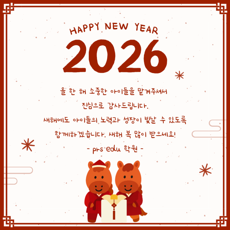 올 한 해 소중한 아이들을 저희 PRS EDU 학원에 맡겨주셔서 진심으로 감사드립니다. 새해에도 아이들의 노력과 성장이 빛날 수 있도록 함께하겠습니다. 행복하고 따뜻한 새해 맞이하시길 바랍니다. 새해 복 많이 받으세요 ~ ! - PRS EDU 학원 - 상담문의 031.480.2128 초등관 031.362.5032 중고등관 <img src="https://blogthumb.pstatic.net/MjAyNTEyMzFfNzcg/MDAxNzY3MTc1MTUxNTgy.TX8Vl_nojUJJUVMZMrXcGcPZRmIzLmjsc25VqDRIegwg.OF8lY3BwDcIXcEPwSwfKhjFoXfn1eWbE6HyvNppMNeMg.PNG/2026_%BB%F5%C7%D8%C0%CE%BB%E7.png?type=s3" />