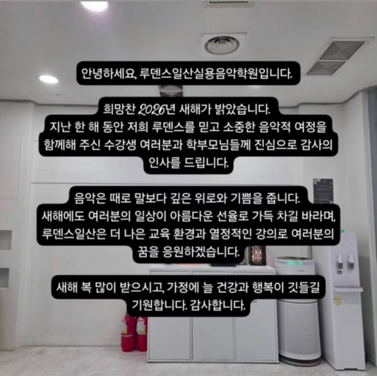 안녕하세요, 루덴스일산실용음악학원입니다. 희망찬 2026년 새해가 밝았습니다. 지난 한 해 동안 저희 루덴스를 믿고 소중한 음악적 여정을 함께해 주신 수강생 여러분과 학부모님들께 진심으로 감사의 인사를 드립니다. 음악은 때로 말보다 깊은 위로와 기쁨을 줍니다. 새해에도 여러분의 일상이 아름다운 선율로 가득 차길 바라며, 루덴스일산은 더 나은 교육 환경과 열정적인 강의로 여러분의 꿈을 응원하겠습니다. 새해 복 많이 받으시고, 가정에 늘 건강과 행복이 깃들길 기원합니다. <img src="https://blogthumb.pstatic.net/MjAyNTEyMzFfMjIg/MDAxNzY3MTkwNjA5ODU4.O6T2GzzDaI_dV0uPapFHzXtmv2_rkiAKGG-5sAWfJLEg.3ZW631Qsv8I8NgxxDrLPzmWEdH9cd_BaN8UyTRv5yBAg.JPEG/900%A3%DFScreenshot%A3%DF20251231%A3%DF230542%A3%DFInstagram.jpg?type=s3" />