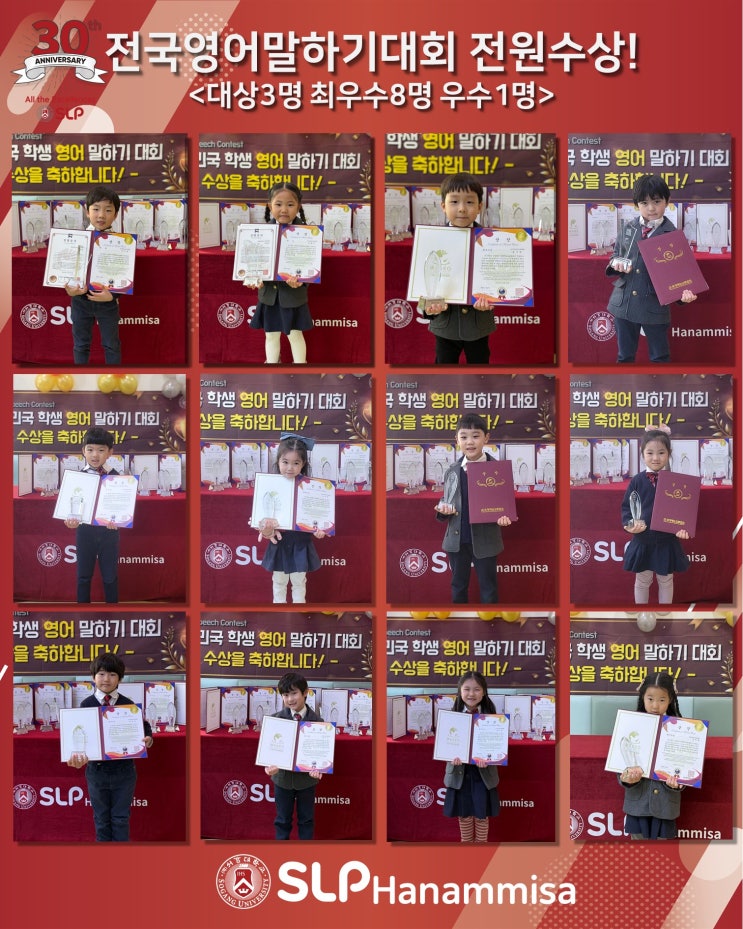 학부모님 안녕하세요! SLP하남미사어학원입니다! 우리 유치부 아이들 11월 30일에 전국영어말하기대회에 참가하였습니다! 한달동안 원에서 매일 연습하면서 발음, 속도, 목소리, 시선, 제스쳐 등을 열심히 배우면서 포기하지 않고 잘 따라와준 우리 아이들 너무 기특하고 자랑스럽습니다~! 참석한 12명 모두 대상 3명, 최우수상 8명, 우수상 1명이라는 너무나도 좋은 결과가 나왔습니다. 또, 대상을 수상한 아이들이 전체 참가자 중 1등, 6등, 10등을 차지하면서 상위권 등수를 모두 휩쓸어왔습니다. 이번 대회를 경험삼아 아이들이 더욱 더 큰 무대에서 떨지 않고 자신을 표현하기를 바랍니다~! https://www.instagram.com/slp_hanammisa/ #하남....... <img src="https://blogthumb.pstatic.net/MjAyNTEyMTFfODEg/MDAxNzY1NDI3OTI2Mzc5.DXO7tub-XN1rTW3aO-fb4vMiOaoLm_faDsA9IBf2C5kg.ietI6LgJfcwSgLur-KDSSHMwjapaO2xVeoMy60yxxXog.JPEG/%C0%FC%B1%B9%BF%B5%BE%EE%B8%BB%C7%CF%B1%E2%B4%EB%C8%B8_%BC%F6%BB%F3.jpg?type=s3" />