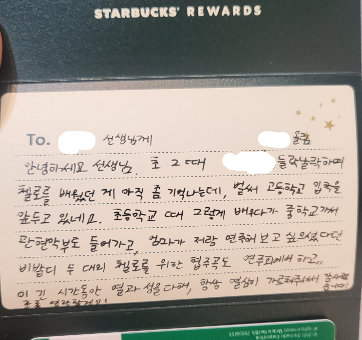 성탄절이 끝나고 매서운 한파가 찾아온 오늘, 조금은 아쉽지만 마음 깊이 따뜻해지는 소식을 전합니다. 초등학교 2학년 때 처음 첼로를 잡고, 중학교 3학년까지 긴 시간을 함께 음악으로 성장해 온 제자가 고등학생이 되면서 이제는 공부에 더 집중해 보겠다며 정성스럽게 손편지를 남기고 갔어요. 글씨 하나, 문장 하나에 그동안의 시간과 마음이 담겨 있어 편지를 읽는 내내 여러 감정이 교차했습니다. 늘 공부도 잘하고, 무엇보다 성품이 참 반듯했던 아이. 고등학교 생활도 모범적으로 잘 해내고, 대입에서도 분명 좋은 결과가 있을 거라 믿으며 진심으로 기도합니다. 첼로를 내려놓는 선택이 결코 음악과의 이별이 아니라 다음 성장을 위한....... <img src="https://blogthumb.pstatic.net/MjAyNTEyMjZfMjM4/MDAxNzY2NzM4OTQ5NjM2.YI5B15yBoMN4isa0EEBKaBo2LryHswzg_oZcOFb0MbEg.dop0Are_1Cys5VTndt8m73GUFcESxBCtSExErtdXitUg.PNG/%BC%D5%C6%ED%C1%F6.png?type=s3" />