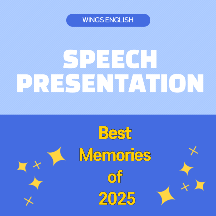 안녕하세요. 영어를 느끼고 즐기고 표현하는 것을 중요하게 생각하는 윙스잉글리쉬입니다. 2025년 한 해를 마무리하며, 우리 아이들은 2025년의 가장 기억에 남았던 순간을 영어로 발표해보는 뜻 깊은 시간을 가졌습니다. 아이들은 각자 가장 기억에 남는 순간을 떠울리며 영어로 글을 쓰고 직접 발표하는 경험을 하였습니다. 이번 스피치 준비를 통해 무엇을 말할지 스스로 정하고, 문장을 다듬고, 친구들 앞에서 연습하며 영어를 사용하는 경험을 쌓는 시간을 가졌습니다. 자신의 말을 전달하는 것도 중요하지만 다른 친구들이 발표하는 것도 귀기울여 듣는 태도도 중요함을 느낀 시간이었습니다. 긴장한 친구들, 무대 체질인 친구들, 연습이 덜....... <img src="https://blogthumb.pstatic.net/MjAyNTEyMzBfMTcw/MDAxNzY3MDc3NzY4NTIy.kp4oalH61tJamTlvwAN-RNh4A4gkdAh-52lpNjS4TWkg.YOwRzc7oA1Lza20ErVaOWEEaFdfp1Q5mhAh55wHJPtAg.PNG/%C1%A6%B8%F1%C0%BB-%C0%D4%B7%C2%C7%D8%C1%D6%BC%BC%BF%E4_-001_%281%29.png?type=s3" />