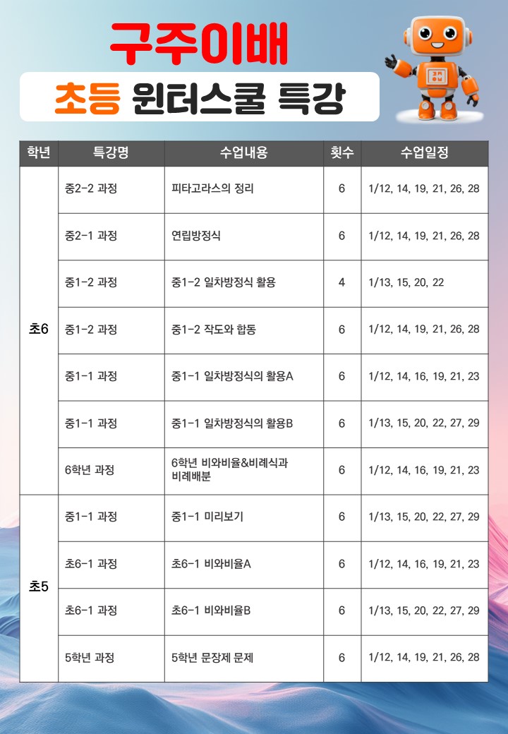 안녕하세요 구주이배 미사본원입니다^^ 구주이배에서 윈터스쿨 겨울방학 프로그램을 개강합니다! 이에 미사본원 초,중등 특강에 대해 안내드립니다. ※특강은 재원생이 아닌 경우 학생의 성취도 확인을 위하여 입학고사가 필수로 진행됩니다. * 구주이배 미사본원 겨울 특강 개강일 * 1월12일(월) * 구주이배 미사본원 겨울 특강 시간* [1부] 10:30~13:00, [2부] 13:00~15:30 * 구주이배 미사본원 겨울 특강 셔틀 버스 시간표 * ★연/특강 셔틀 운영기간:1월12일(월)~2월6일(금) 겨울방학은 부족한 부분을 채울 수 있는 최적의 시간입니다. 학년별/진도별 연·특강이 준비되어 있으니, 겨울방학 시간을 활용하여 수학 실력을 완성해 보세요! ....... <img src="https://blogthumb.pstatic.net/MjAyNjAxMDVfODgg/MDAxNzY3NjExNDQ1NjA5.978fQMnLTnv5kc3pn8uv6uso_ONMF7jh63GZjDbP8WUg.ydUhHCld_rO7bIc1uABCJDmiMC_s6mOFUmuF3PN73Rkg.JPEG/KakaoTalk_20251231_170819728_01.jpg?type=s3" />