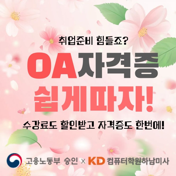 OA 컴퓨터 자격증 한 달 완성 과정 모음! ✔ 사무실무 + 자격증 한 번에 ✔ 단기 속성으로 빠르게 취득 가능 MS엑셀, 왜 배워야 할까요? 엑셀은 단순한 프로그램이 아니라 사무직 취업의 기본 스킬입니다. ✔ 업무 효율 UP 자료 정리, 계산, 보고서 작성까지 빠르게 처리 가능 ✔ 회사에서 가장 많이 사용하는 프로그램 거의 모든 사무직에서 필수로 사용 ✔ 취업 경쟁력 상승 컴활, ITQ 자격증으로 스펙까지 챙길 수 있음 ✔ 실생활에서도 활용 가능 가계부, 일정관리, 데이터 정리 등 다양하게 활용 MS워드, 왜 배워야 할까요? MS워드는 단순한 문서 작성이 아니라 회사 문서 작업의 기본 도구입니다. ✔ 보고서·문서 작성....... <img src="https://blogthumb.pstatic.net/MjAyNjA0MDJfNjAg/MDAxNzc1MTEwMjU1NzA0.MyF7iTUBPSbcp-IsmoxC7r7oSYikbQj_BKAgjKbDhWwg.lUDvnBiNajsfn2gqonqGYVtLUo-sDc47dlmbjt8Hxy0g.JPEG/2.jpg?type=s3" />
