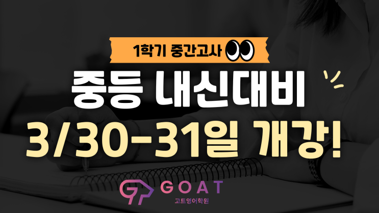안녕하세요 고트영어입니다. 이제 중등 내신이 코앞으로 다가왔네요. 고트영어는 3/30-31[ 월요일 혹은 화요일 ] 에 시작합니다. 시간표는 아래 참고해주세요 결과가 다른 내신, '고트영어'는 왜 500문제만 풀리고도 성적이 나올까? 수천 문제를 기계적으로 풀리는 학원은 많습니다. 하지만 고트영어는 다릅니다. 우리는 아이가 진짜 이해했는지'를 집요하게 확인하는 데 집중합니다. "양보다 질" — 2,000문제 대신 '완벽한 500문제' 시험 기간이라고 갑자기 문제 폭탄을 던지지 않습니다. 수천 문제를 풀어도 틀리는 유형을 계속 틀린다면 의미가 없기 때문입니다. 고트영어는 3주 동안 개별 문법 개념 하....... <img src="https://blogthumb.pstatic.net/MjAyNjAzMjNfMjM2/MDAxNzc0MjU3Njg1MTgw.aairPYK2-P3jtKQ3XRT7sKmtB5DK8YOnfGsA70N8Fw8g.QQd4EqVYE6UKW3N8n5ljCAlM0rGaBUbWYwIuM-j2t6kg.PNG/%C1%A6%B8%F1%C0%BB-%C0%D4%B7%C2%C7%D8%C1%D6%BC%BC%BF%E4_-002_%287%29.png?type=s3" />