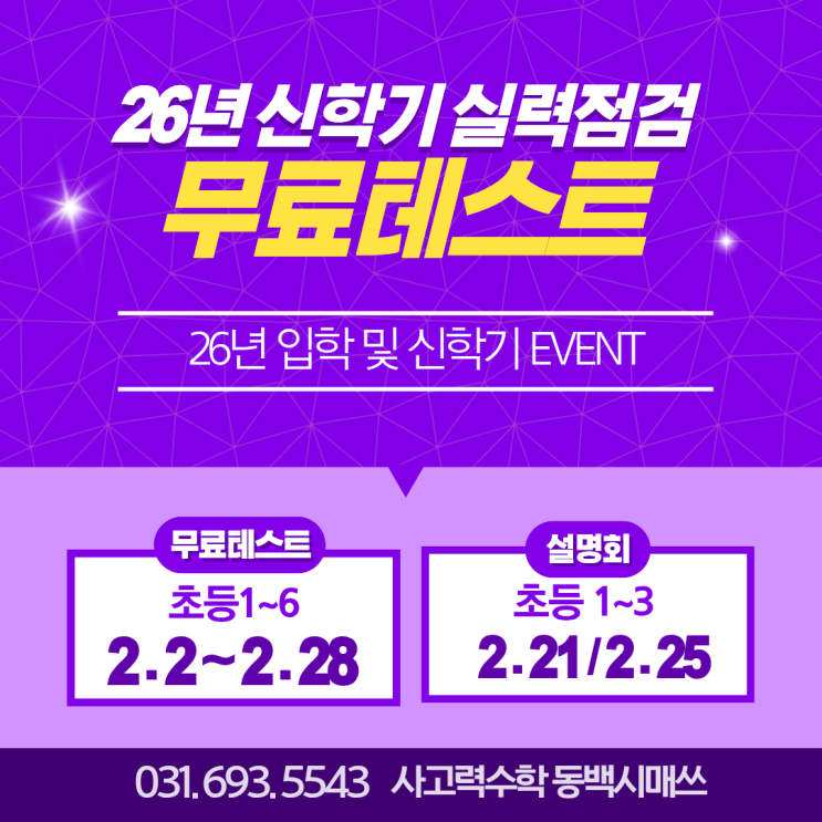 신학기 이벤트 (~2.28) ✅무료 입학테스트✅ *대상* 초1~6 *기간* ~2.28(토) *내용* 사고력+교과 문항 수학 5대 영역 골고루 평가 신청 https://apply.cmath.co.kr/23071/dongbaek - 원하는 날짜 선택후 선결제 - 선결제후 테스트 당일 결제취소 - 테스트 당일 취소시 환불 불가 <img src="https://blogthumb.pstatic.net/MjAyNjAyMjVfMjQ3/MDAxNzcxOTgxNzAxMDEy.vfSg_sysRiOmJhqp78sEphEb0R0VrDpsof1pSofuZLwg.rhK5a_nX9wqBGIdqiU-5zx9eskzdiKiilfVhWXuZa0Ag.PNG/%C1%A6%B8%F1%C0%BB_%C0%D4%B7%C2%C7%D8%C1%D6%BC%BC%BF%E4._-_2026-02-25T091702.959.png?type=s3" />
