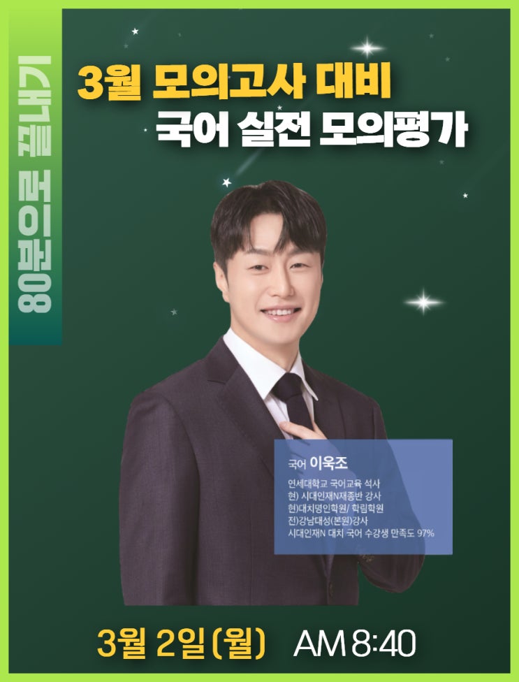 방학동안 각자의 방법으로 열심히 공부한 고3들! 방학동안 내 실력이 향상되었는지 아니면 그 자리인지 객관적으로 평가해보고 앞으로 남은 시간을 어떻게 보낼 지 고민해봐야 할 시간입니다. 이에 대체 공휴일에 고3 재원생과 비재원생들을 위해 현 대치-시대인재학원 재종반 탑-티어 이욱조 샘의 컨텐츠로 학습량과 취약 단원을 확인하고 학습 전략과 최저 학력 기준의 충족 가능성을 확인해 보는 시간을 갖습니다. ▶대상: 고3이면 누구든 ▶날짜 : 3/2(화) ▶시간: AM 8:40 (8:20까지 입실) ▶ 소요시간 : 80분 ▶응시료 : 10,000원-비재원생도 응시 가능 ※재원생은 학원에서 경비 부담 이욱조T의 3모 실전 모의평가 효과는... 1.2026학년도....... <img src="https://blogthumb.pstatic.net/MjAyNjAyMjVfMjY4/MDAxNzcyMDIzNDg5MjU2.anQk8uw5zpNjIwLwXAf750xT6aIzdKlpCPPFrDoMhAkg.7tjqQcegvSZMAoWc_zavN0PmhR1P7CxlU4ooo6o0vcsg.JPEG/%C1%A6%B8%F1%C0%BB_%C0%D4%B7%C2%C7%CF%BC%BC%BF%E4_%2814%29.jpg?type=s3" />