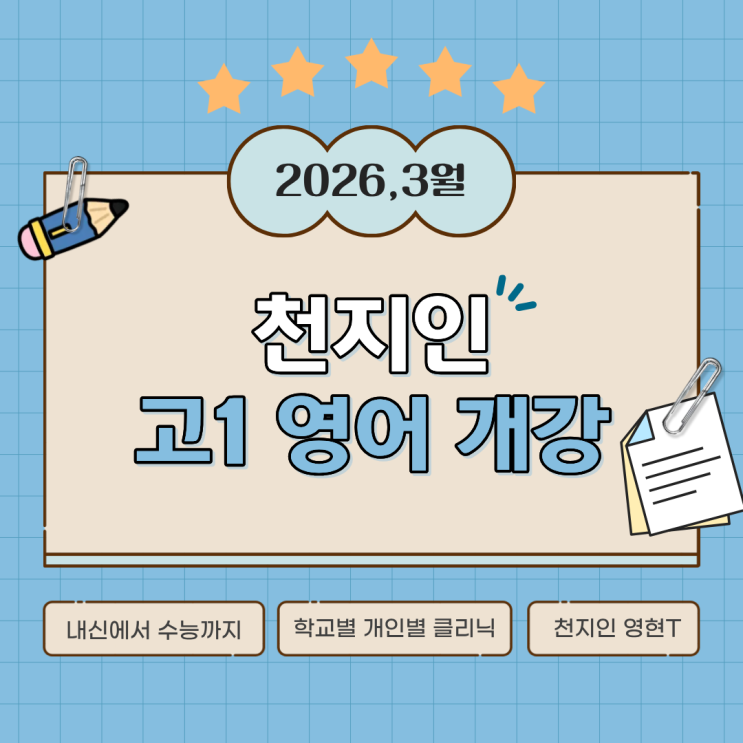 안녕하세요~ 천지인학원 영현T입니다. 다가오는 3월, 새학기 고1 친구들의 영어수업에 대해 안내해 드립니다~ 3월, 고1 영어의 방향을 결정하는 첫 출발 고등학교 1학년의 3월은 단순한 새 학기의 시작이 아닙니다. 이 시기는 앞으로의 3년을 좌우할 학습 습관과 실력의 방향을 잡는 중요한 시기입니다. 천지인은 3월 수업을 ‘새로운 진도’가 아니라 겨울 학습 점검 + 첫 모의고사 대비 + 첫 내신 준비라는 세 가지 방향으로 설정하고 진행합니다. ✔️ 3월 학습 핵심 목표 1️⃣ 12월~2월 학습 내용 점검 & 취약 영역 집중 보완 겨울방학 동안 공부한 내용이 제대로 체화되었는지 확인합니다. 어휘·구문·독해 속도·논리 파악 능력을....... <img src="https://blogthumb.pstatic.net/MjAyNjAyMjNfMjk0/MDAxNzcxODE5NDA5Nzc2.tsIsoInQ6nsQ78wPS0gLyWJhea4tMczF_f6s1KlOmxEg.0R65esYmOdlh22fT9MDG7Jiy4g1PHCMcNVo4dhjVmDEg.PNG/1.png?type=s3" />