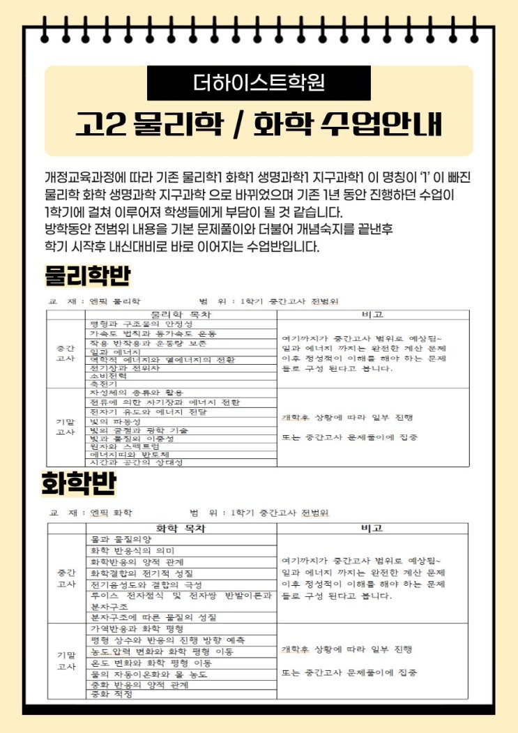<고2 물리, 화학 수업 개강안내>