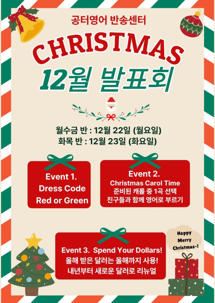 안녕하세요! 아이들의 영어 성장을 함께하는 공터영어 반송센터입니다. 다가오는 크리스마스를 맞아 우리 아이들이 영어로 즐기고, 웃고, 참여하는 특별한 크리스마스 발표회가 진행 됩니다. 공터영어 반송센터 크리스마스 발표회 & Market Day EVENT 안내 1. Christmas Dress Code Red / Green중 한 가지 색상의 의상을 입고 등원하면 공터영어 달러 200달러 지급! 2. Christmas Carol 부르기 준비된 캐롤 중 한 곡을 선택해 친구들과 함께 또는 개인 영어로 캐롤 부르기 영어 발음 + 자신감 + 발표 경험까지 한 번에! ※캐롤은 필수 아닌 선택 사항 입니다. ^^ 3. 달러 소진 이벤트 올해 모은 달러를 사용해....... <img src="https://blogthumb.pstatic.net/MjAyNTEyMTlfMTkx/MDAxNzY2MTE1NzYyMjM2.oeDQZThDh9wXDY4RPjdDK8ezAiL9vFDgz7XgF5ipDosg.xwmA4q_xQGGs-wsUfxx736BavI-M9OJ1SkmWIorX4E4g.JPEG/%C1%A6%B8%F1%C0%BB_%C0%D4%B7%C2%C7%D8%C1%D6%BC%BC%BF%E4._%281%29.jpg?type=s3" />