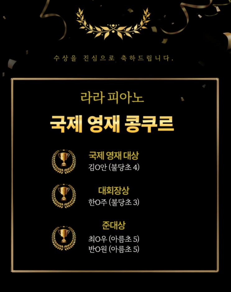 안녕하세요 우리 아이들과 함께 국제영재콩쿠르에 다녀왔습니다 연주 실력뿐 아니라 마음까지 한단계 성장하는 소중한 시간을 보냈는데요~ 콩쿠르 준비과정은 단순히 곡을 완성하는 시간이 아니라 집중하는 법을 배우고 실수 앞에서도 다시 마음을 다잡는 연습의 연속인것 같네요^^ 하반기 콩쿨 무대 위에서의 한음한음의 기술보다는 아이들안에 쌓인 집중력. 인내력. 자신감을 보여주는 시간이였습니다 이번 콩쿠르를 발판 삼아 앞으로 음악을 대하는 태도와 연주가 더 깊어질 아이들의 다음 모습을 기대하며 응원합니다♡ 교육 상담 : 561 - 9173 #국제영재콩쿠르 #신불당피아노 #아름초피아노 #불당초피아노 #라라피아노 #이튼유치원 <img src="https://blogthumb.pstatic.net/MjAyNTEyMTNfMjY0/MDAxNzY1NjMzNTk4OTM5._mHN_eH2bDBUYCrpGkXsxMJyw-XSWAFz2-1xENX1aU0g.YTHwFUebEz6Q8sz3g3cgiBHxQAgeZItngHv9UQiMIUsg.JPEG/900%A3%DF1765621717670.jpg?type=s3" />