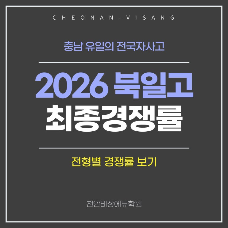 대한민국 단 10개 뿐인 전국자사고! 그 가운데 유일하게 충남에 위치한 북일고는 우리 충남 지역 최상위권들은 물론 전국의 뛰어난 인재들을 길러내고 있는 명문고교입니다. 지난 12월 10일, 2026학년도 북일고등학교 신입생 모집 최종 경쟁률이 발표되었는데요. 총 모집인원 360명에 지원인원 379명으로 경쟁률은 1.05:1입니다만, 정원내 모집을 기준으로 하면 360명 모집에 360명 지원으로 1:1입니다. 지난해 1.54:1의 경쟁률보다 상당진 낮아진 모습이고, 인근 광역자사고인 삼성고 경쟁률이 올라간 것과도 비교되는 수치입니다. 전형별로 보겠습니다. 전체 정원 가운데 약 75퍼센트를 차지하는 272명을 선발하는 일반전형, 그 가운데 타 시도....... <img src="https://blogthumb.pstatic.net/MjAyNTEyMTVfOTkg/MDAxNzY1NzgyMjUxMjkx.7DzK71I_Mv5MLXCvGj0mEoiYuzTtKqoN0dsUUrP1Hzsg.hjn-VBAy8zPPF0TaIPOuYysygVcZ_o8z056x2uO_duMg.JPEG/%C3%B5%BE%C8%BA%F1%BB%F3%BF%A1%B5%E02026%BA%CF%C0%CF%B0%ED%C3%D6%C1%BE%B0%E6%C0%EF%B7%FC%BD%E6%B3%D7%C0%CF.jpg?type=s3" />
