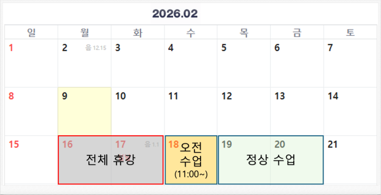 안녕하세요~ 쥬발레아카데미입니다. 신규 회원님들께서 설 연휴 휴강 일정 많이들 문의주셔서 별도 공지드립니다. 2.16.(월)~17.(화) 전체 휴강 2.18.(수) 11시 원장쌤 수업 입문반, 레벨 1·2 누구나 수강 가능 저희는 기본적으로 법정공휴일 빨간 날 쉬는데요. 네이버 플레이스나 네이버 지도 앱에서 쥬발레 검색하시면 2/16(월) ~ 2/18(수) 설 연휴 휴무 안내 확인하실 수 있습니다. 연휴 마지막 날인 2/18(수) 오전 11시에 원장쌤이 한 클래스 진행하시는데요. 연휴 동안 굳은 몸 푸시라고 가볍게 수업 진행 예정이오니 입문반, 레벨 1, 2 무관하게 시간 되시는 회원님들은 많이많이 참여해 주세요. 2026년 새해 들어서면서부터 쥬발레 최....... <img src="https://blogthumb.pstatic.net/MjAyNjAyMDlfMjU3/MDAxNzcwNjEyNTcxNjYw.cXFcZWxQMb287vRET2Mbls26LtC6NMfmU_0-KqC7hIog.d96YgAfrGbt1VAhsgTYHH3-Xb7qNRwaflZrCNg0h0vwg.PNG/2%BF%F9.png?type=s3" />
