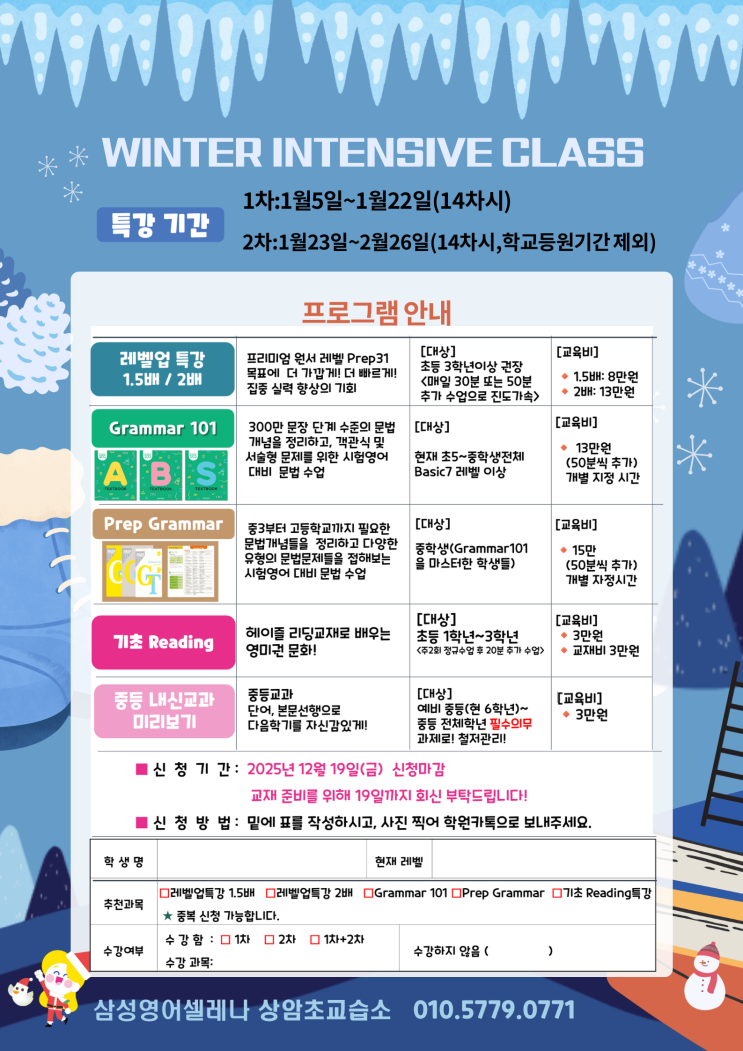 안녕하세요? 삼성영어셀레나 상암초교습소입니다! 12월도 벌써 절반이나 지나갔네요. 우리 아이들 다음 주면 크리스마스 휴일과 함께 방학도 시작할 텐데요. 겨울방학 계획은 다들 세우셨나요? 영어 학습에 있어서 제가 처음부터 계속 강조해 오는 것은 바로 '습관'입니다. 방학 중에 이 공부 습관이 무너져 버리면 다시 바로 잡기가 힘들잖아요. 그리고 긴 겨울방학을 유의미하게 보내기 위해서는 운동이든 공부든 무엇인가에 몰입하는 경험도 필요합니다. 오늘은 우리 아이들이 방학 동안 영어 실력을 키울 수 있는 겨울방학 특강을 안내해 드리려고 합니다. 이번 방학에는 평소보다 진도를 빠르게 나갈 수 있는 <레벨업 특강>....... <img src="https://blogthumb.pstatic.net/MjAyNTEyMTdfMjc1/MDAxNzY1OTUyNTQ0Mjg4.4Chz-p8X0W0sytb4EDCwfLO8cgUyQVaorcXSvKrNo6Ug.6JiMOpr0s5rB12d6G2H4zWSF5ul0M4RmThZ68cmBJ8kg.PNG/%B0%DC%BF%EF%B9%E6%C7%D0%C6%AF%B0%AD_%282026%29.png?type=s3" />
