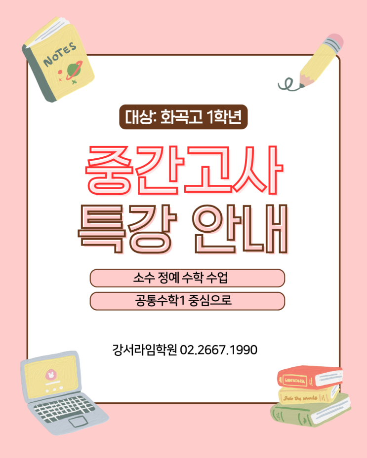 !! 2026년 3월 개강 시간표 안내 !! ** 고등부 ** 주 2강, 1강 120분 *고등 1학년* 01. 등촌고(-3명) 목: Pm 04:30~06:30 일: Pm 05:00~07:00 02. 경복여고(-4명) 목: Pm 08:00~10:00 일: Pm 01:00~03:00 03. 마포고(-4명) 금: Pm 05:00~07:00 일: Pm 01:00~03:00 04. 동양고(-4명) 월: Pm 05:00~07:00 목: Pm 04:30~06:30 *고등 2학년* 01. 등촌고/세현고(-2명) 수: Pm 04:30~06:30 일: Am 11:00~01:00 02. 등촌고/화곡고(-2명) 수: Pm 06:30~08:30 일: Pm 03:00~05:00 03. 마포고(-2명) 화: Pm 04:30~06:30 토: Pm 03:00~05:00 04. 경복여고(-2명) 토: Am 11:00~01:00 토: Pm 03:00~05:00 **중등부** 주 2강, 1강 900분 *중등 1학년* 01. 등명....... <img src="https://blogthumb.pstatic.net/MjAyNjAyMTJfOTEg/MDAxNzcwODk4Mjc4NzY1.bBJnvbV0KYBEOLHrWooSxspNAfuUSU1PlLV6F82OlNQg.ikEOaKU-j-2F0u1GaMNPfTOtQ1O-r0YzEOTIbx2y7isg.PNG/%C1%A6%B8%F1%C0%BB_%C0%D4%B7%C2%C7%D8%C1%D6%BC%BC%BF%E4_-005_%283%29.png?type=s3" />