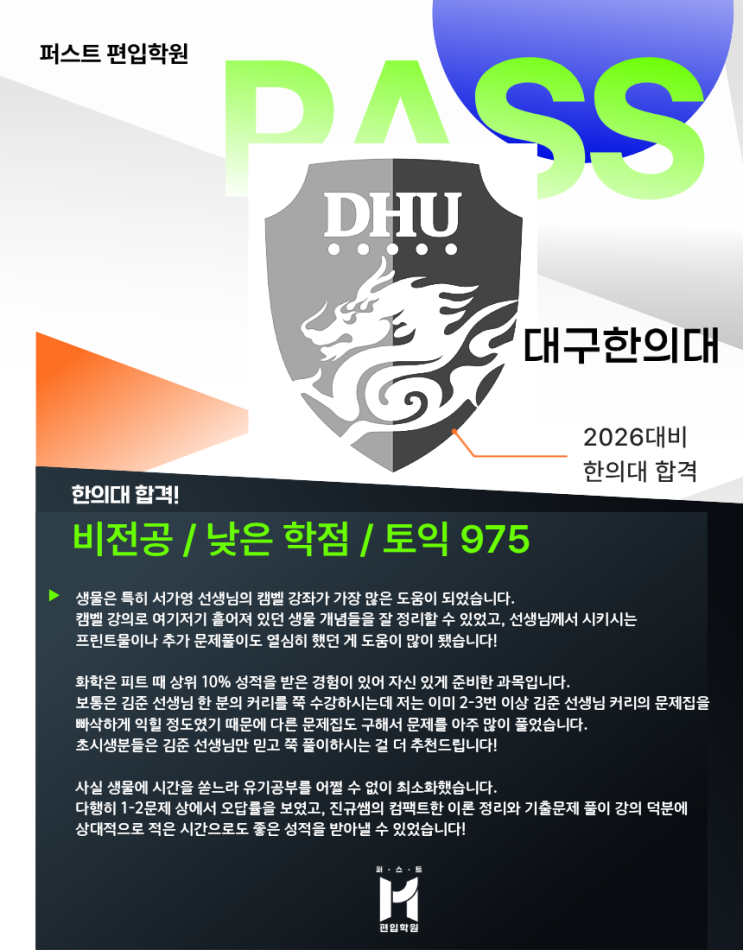 안녕하세요 2026대비 퍼스트 편입 수강분들의 합격 수기가 나오고 있습니다. 2027대비 준비하시는 수험생분들의 좋은 결과를 응원합니다. 늦었지만 몰입과 꾸준함으로 결국 합격! 퍼스트편입 선생님들은 이미 너무 자명한 선생들의 강의로 주저 없이 선택! ㅁ 공부하면서 힘든점 - 저는 이전에 이미 실패를 겪었던 사람으로서 주위 친구들이 벌써 회사에 다닐 나이였습니다. 남들과 비교하고 싶지않은데 자꾸 비교되는 현실이 힘들어서 모든 sns와 연락을 차단했습니다. 유튜브 또한 밥먹는 시간과 운동하는 시간에만 토익공부용으로 본 것이 전부였습니다! ㅁ 수험생에게 하고싶은말 - 얼마나 힘든 길인지 수험생이었던 제가 누구보다 잘 알고 있....... <img src="https://blogthumb.pstatic.net/MjAyNjAyMTNfMjQ3/MDAxNzcwOTY4MjA1MzIw.4faV7D1v8nZpjbueY0_SQzQYCGcSsWPAaLQAJguBbeIg.CcI_jA9OsaGl2xiok94s7XsolgjjUYQ4KKqU_HNtlW4g.PNG/firstpmd_pass.png?type=s3" />