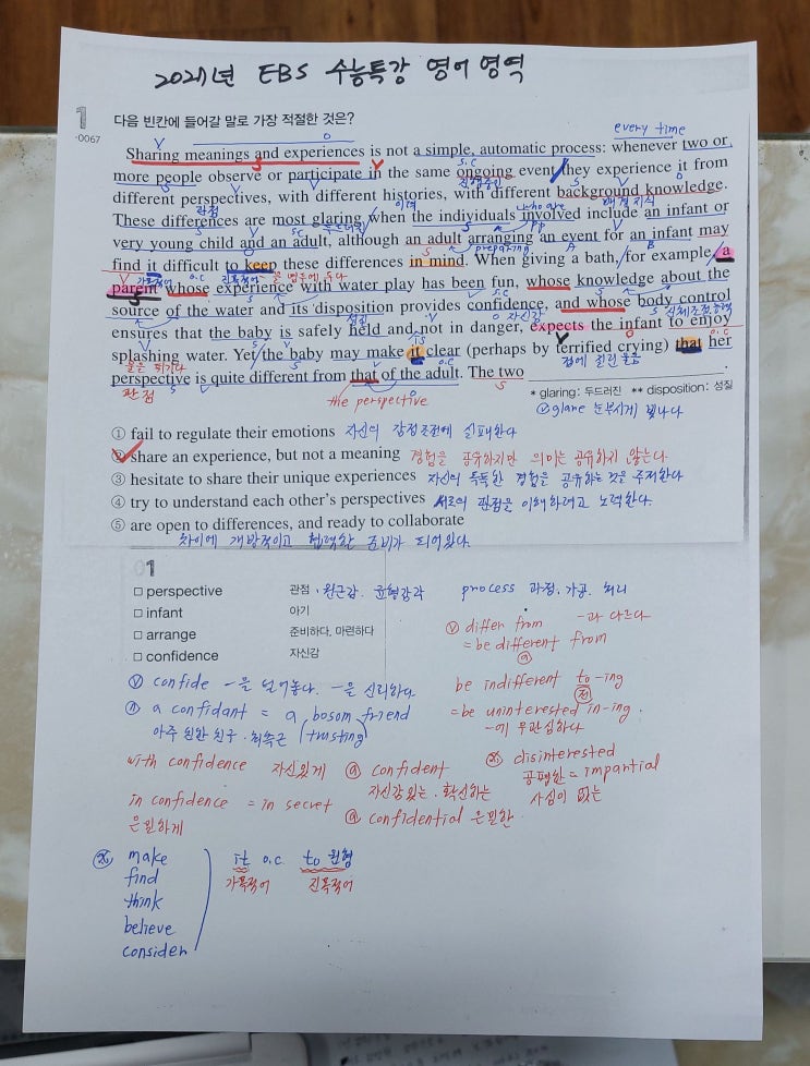 안녕하세요 대치동 엑설런스 영어 학원 입니다. 2027 EBS 수능특강 영어영역 독해 – 빈칸 추론 유형으로, 수능에 **아주 전형적으로 나오는 ‘관점(perspective) 차이’**를 묻는 문제입니다. 차분하게 출제 의도 → 구조 → 정답 논리 순서로 분석해볼게요. 1️⃣ 지문 핵심 주제 한 줄 요약 같은 경험을 해도 사람마다 ‘의미’는 다르게 받아들인다. 특히 어른과 아기처럼 관점이 극단적으로 다른 경우, 같은 상황을 전혀 다르게 인식한다. 2️⃣ 문단 구조 분석 (수능식 독해 포인트) ① 첫 문장 = 주제 제시 (Topic Sentence) Sharing meanings and experiences is not a simple, automatic process. ✔️ 경험과 의미를 공....... <img src="https://blogthumb.pstatic.net/MjAyNjAyMjZfMTAw/MDAxNzcyMTA2NzkyNzQ0.1iusQECb0MaAL8Gm6f9SOwnAw_NlPBI2Vc7JTQKO-C4g._8s7KCpAMJp5y-RWWOVmDeq0mWZ_n1uIFNGu1PgfWKIg.JPEG/%BC%F6%B4%C9%C6%AF%B0%AD.jpg?type=s3" />