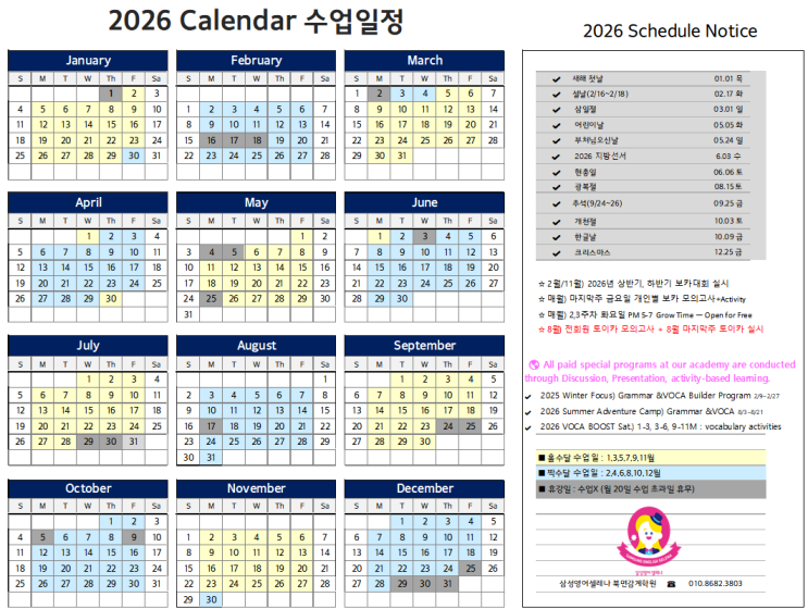 삼성영어셀레나 친구들 _2026년 수업 일정 연간 계획 공유드려요~ [ 창원북면감계_삼성영어셀레나북면감계학원]