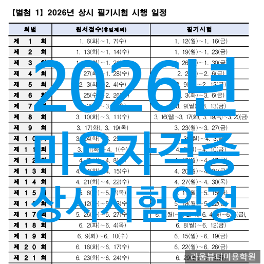 안녕하세요^-^ 라움뷰티미용학원입니다 드디어 2026년 미용사 일반, 메이크업, 피부, 네일의 시험 일정이 공개되었어요 !! 2025년 아쉽게 자격증 취득을 못 하신 분들! 2026년 새로운 도전으로 미용 자격증 취득하고 싶으신 분들! 모두 2026년에는 자격증 취득에 도전해 보아요 필기 시험 일정이에요 필기 시험은 거의 1주일에 1번씩 접수가 있는데요! 저희 라움뷰티미용학원은 필기는 거의 원패스 하지만 혹~시나 불합격해도 다음주에 또 접수 하실 수 있다는 점! 필기 공부도 라움뷰티미용학원과 함께라면 원패스 문제없어요 필기시험에 합격하면 실기 접수가 가능합니다! 실기 접수는 2주에 한번씩 있지만 접수 한 회차의 합격자 발표가 난 후....... <img src="https://blogthumb.pstatic.net/MjAyNTEyMjNfMTky/MDAxNzY2NDUyMDEyOTQx.nh2UqCh5dRJ4gUYEgiKC05th2AD5COjxbyLi_EB4ycog.w6vAKZM62GBpCv4IcSPEXe1idMu4QNa8-ERE0joQ8Bkg.PNG/image.png?type=s3" />