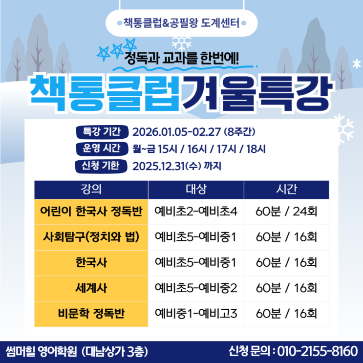 안녕하세요^^ <책통클럽 도계센터> 입니다. 책통클럽 도계센터에서 *겨울특강*을 진행합니다! 이번 방학은 '읽는 힘'부터 기르세요! 겨울방학은 아이들의 기본기를 다지기 가장 좋은 시기입니다. 읽기능력이 곧 학습과 공부능력으로 이어집니다. ✅ 책통클럽만의 특허받은 정독법 ✅ 잘 읽고, 잘 찾고, 잘 쓰게 되는 3잘 독서법 훈련 ✅ 균형 독서를 통한 이해력&사고력 확장! 새학년 새학기를 대비하는 지금! 비문학/사회탐구/한국사/세계사 독서와 교과를 한번에 잡아줄 수 있는 핵심 특강들로 준비했습니다. 내신과 수능의 밑바탕을 만드는 책통클럽, <책통클럽 도계센터>에서 경험해보세요! 체계적인 시스템+아....... <img src="https://blogthumb.pstatic.net/MjAyNTEyMjNfNTIg/MDAxNzY2NDY3OTk2ODQy.Bh-bynXQ2z4oA3z1ggonhGHVlbEoVePwLxX782F3h8Eg.nFFO6WZGeHshHSjNvxjhk2Rwfy7OJjocP3N2KRFAyt8g.PNG/%C1%A6%B8%F1%C0%BB_%C0%D4%B7%C2%C7%D8%C1%D6%BC%BC%BF%E4_-001.png?type=s3" />