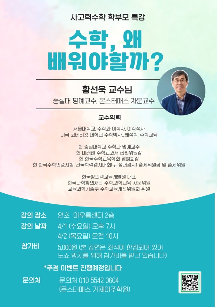 몬스터매스 학부모 특별 강연 미래엔교과서 집필 저자이자 한국 창의력 교육개발원 대표를 모시고 학부모님들께 수학의 본질과 방향을 ‘창의 사고력’ 관점에서 분명히 보여드릴 강연을 준비했습니다. 유아·초등 시기, 무엇을 얼마나 앞서 가느냐보다 어떻게 생각하는 힘을 기르느냐가 더 중요합니다. 이번 강연에서는 창의 사고력의 관점에서 유아·초등 수학을 어떻게 시작해야 하는지, 부모가 가져야 할 명확한 기준을 제시해 드립니다. 가능하시다면 기회가 있을 때 꼭 참석하셔서 직접 듣고 판단해 보시길 권합니다. ✔️ 강의 주제 수학, 왜 배워야 할까? (창의 사고의 중요성 관점) ✔️ 강의 날짜 1회. 4월 1일 저녁 7시 2회. 4월 2....... <img src="https://blogthumb.pstatic.net/MjAyNjAyMjhfMTY0/MDAxNzcyMjcxODk2NTUy.ZPRn0IVEsbrl1tb1tgqlwh0zlgfV0kye5xeCNL9eZXcg.orFrlQO13fPZW2Gzg2OO951DFZHB6UcjG8hBPA1QtWog.JPEG/IMG%A3%DF0265.jpg?type=s3" />