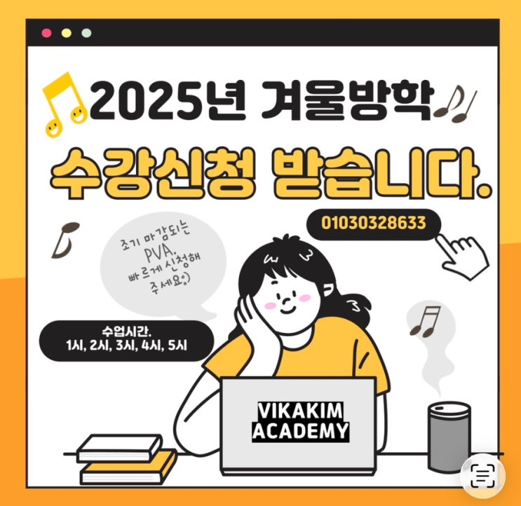 방학 기간 수업 시간 및 신입생 신청 안내 안녕하세요 방학 기간 동안 진행되는 수업 시간과 관련하여 안내드립니다. 방학 수업 시간 •1시 / 2시 / 3시 / 4시 / 5시 원활한 수업 운영과 차량 노선 편성을 위해 ❕이번 주 금요일 12월 26일(금)까지❕ 수업 시간 신청을 부탁드립니다. 또한, 신입생 수강 신청은 12월 마지막 주에 진행될 예정이오니 관심 있으신 분들께서는 참고 부탁드립니다 수업 중에는 상담이 어려울 수 있어 문의 사항은 문자로 남겨주시면 확인 후 모두 순차적으로 전화드려 자세히 안내드리겠습니다:) 항상 믿고 함께해주셔서 감사합니다. 따뜻한 연말 보내세요 비카킴피아노학원 드림 <img src="https://blogthumb.pstatic.net/MjAyNTEyMjNfMTEw/MDAxNzY2NDczODEwNjI0.PL-0rOLW6vShmKjDZtfRY8Z_L34FFEn48legzJRMEK8g.NDp6WIQ0jJLNr7wJqRkuuOk4nXlTqWiUbkVebAB9pUcg.JPEG/IMG%A3%DF5171.jpg?type=s3" />