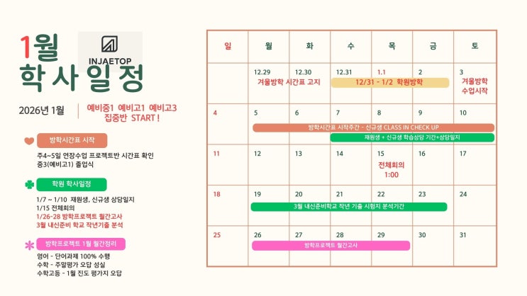 [꿈꾸는 교육 인재탑학원] 망미동 영어,수학학원 - 1월 학사일정