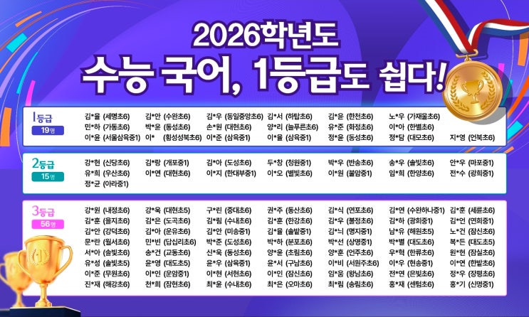 올해도 초등 기파랑2 과정 학생들이 졸업시험으로 수능을 쳤는데요. 달서원 월서초 학생이 3등급을 달성했습니다! 올해 수능 국어가 매우 어려웠다는 사실, 모두 알고 계실 거라 생각합니다. 그래서 더욱 기특하고 감사한데요. 1~3등급 학생들은 이렇게 2026 교재에 이름이 실립니다. 기파랑2 학생들 모두 작년 수능이나 모고에서 2~3등급을 유지하고 있었기에 많이 아쉬워 하는 모습에 마음이 아팠습니다. 졸업시험을 치는 날 컨디션이 좋지 않아 링거 맞고 달려와 준 학생, 1점차로 3등급을 놓친 학생, 너무 너무 자랑스럽고 대견합니다. 그리고 수고 많았습니다! 우리는 중등 기파랑에 도전하며 최고가 되기 위해 또 한발 내딛습니다 :) ....... <img src="https://blogthumb.pstatic.net/MjAyNTEyMjNfMTU0/MDAxNzY2NDczNDY0Mzcy.QhrWTMIle-dIChv9AArebyzQu_KfbiKaRDSTlew4JXgg.RR1JrbGTWPdad35l2XDTxex0GUBb1IT0_y7z2IZqOVog.JPEG/Screenshot_20251223_154006_LINE.jpg?type=s3" />