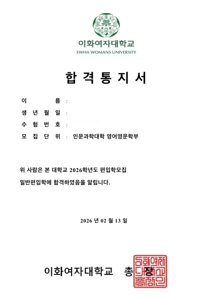 안녕하세요. 저는 이번에 학교를 병행하면서 3월부터 부평 캠퍼스에서편입 준비를 했고 최종적으로 이화여자대학교 영어영문학부에 최종 합격한 김OO입니다. 저는 인천에 있는 전문대를 재학 중이었고 아직 졸업을 하지 못한 상황이었기에 학교와 병행하면서 진행할 수 밖에 없었습니다. 처음에 상담을 받고 그냥 학교를 1년 동안 다니고 편입을 시작할지 아니면 학교를 병행하면서 도전해볼지 많은 고민을 했었습니다. 그러나 상담 해주셨던 선생님께서 한 번 병행하면서 해보기를 권해주셨고 결국 도전해보기로 마음 먹었습니다. 일단 도전해보고 너무 힘들다고 판단이 되면 그 때 가서 환불하고 내년을 기약해도 된다고 생각했습니다. 또 그 당....... <img src="https://blogthumb.pstatic.net/MjAyNjAyMjdfOTgg/MDAxNzcyMTUxMjM5NTgy.rkoBWkIpRv_s2-OsF1HZTYUOu1dUr9ztlc5adcmTuMAg.8TRIyY4lZuxuhdpsv51Oop15VHRDegAxtemKyTv4szUg.PNG/%C0%CC%C8%AD%BF%A9%B4%EB_%B1%E8%BF%AC%BF%EC.png?type=s3" />