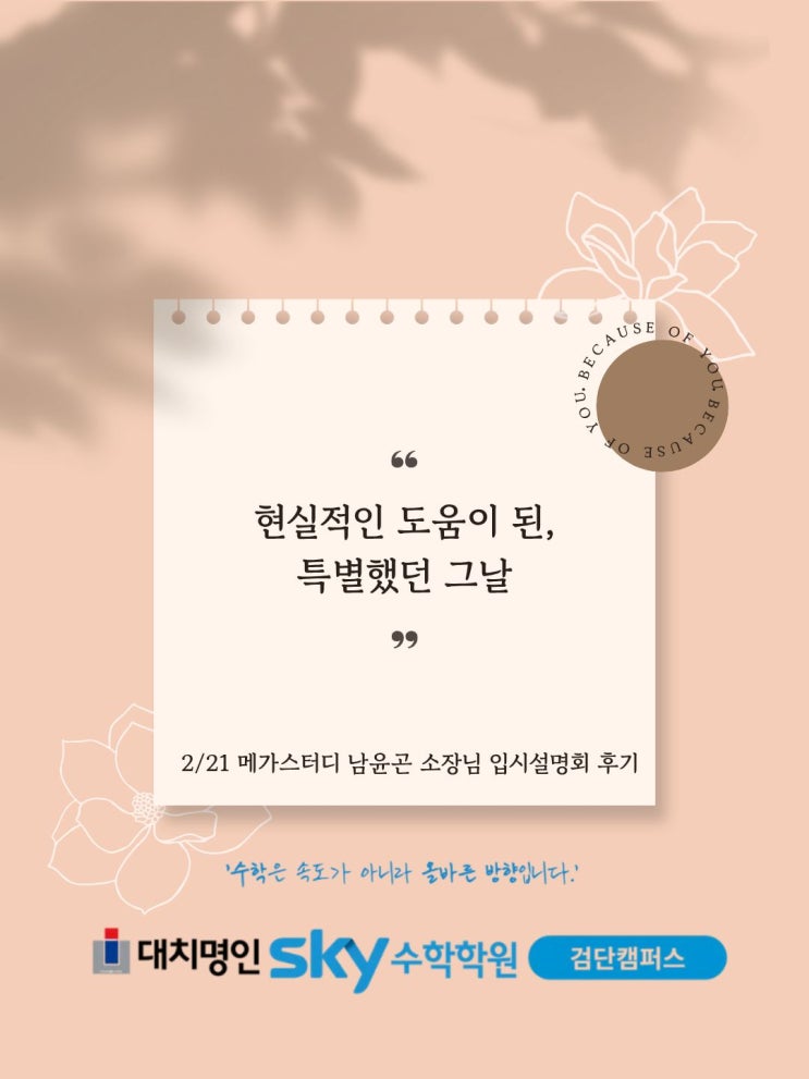 “그동안 들었던 설명회랑 결이 다르네요. 현실적으로 바로 도움이 됐어요.” 검단 수학학원에서 상담을 하다 보면, 요즘 학부모님들의 불안은 한 줄로 정리됩니다. “대입이 바뀐다는데, 우리 아이는 뭘 지금부터 준비해야 하나요?” 그래서 2월 21일, 메가스터디교육 입시전략연구소 남윤곤 소장님을 모시고 예비 고1·고2 ‘수시 전략’ 오프라인 설명회를 진행했습니다. 결론부터 말하면, 이번 설명회는 ‘정보’가 아니라 ‘결정’을 돕는 시간이었습니다. (무엇을 버리고, 무엇을 먼저 잡아야 하는지까지 정리해 주셨습니다.) 1) 왜 학부모 반응이 “이번은 달랐다”였을까 설명회가 끝나고 가장 많이 나온 말은 비슷했습니다. “막연한 얘....... <img src="https://blogthumb.pstatic.net/MjAyNjAyMjdfMjQ1/MDAxNzcyMTg0NjI4ODQ0.XSWEm_oOwMSaASx5vNHwJvwaihq7IcIqYB0DINcX49sg.2H81tGDnRGqaO1hhc9YilRaQqJ0CK0NtGXwiO2JjFqAg.JPEG/%C1%A6%B8%F1%C0%BB_%C0%D4%B7%C2%C7%D8%C1%D6%BC%BC%BF%E4._%2811%29.jpg?type=s3" />