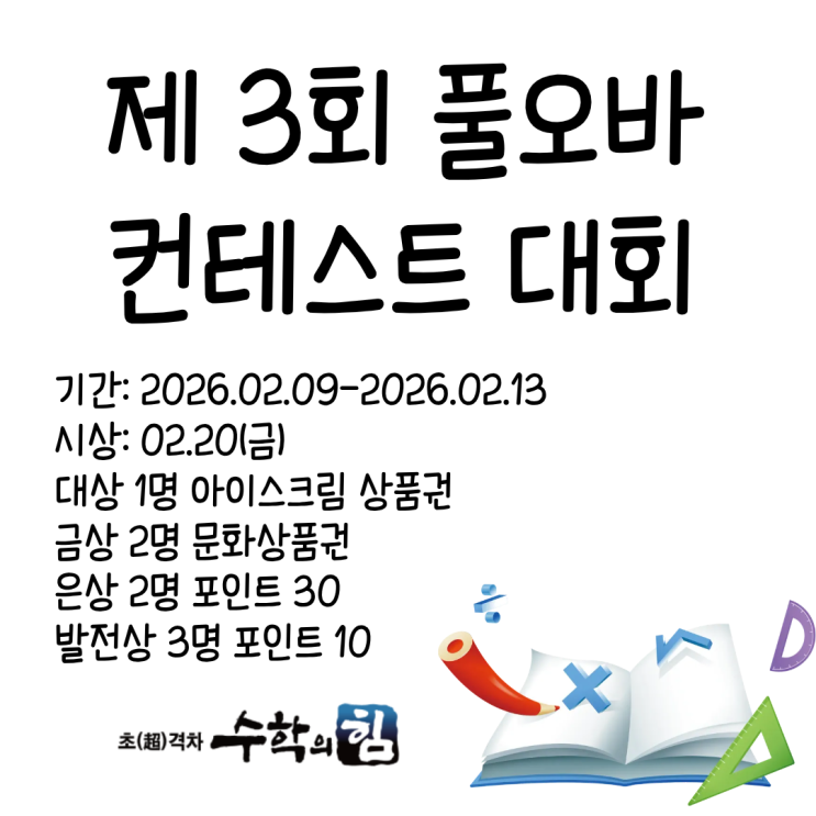 안녕하세요 학원 선호도 1위 '마음에 기술을 더하다' 초격차 수학의힘 수완캠퍼스입니다. 지난주 진행했던 풀이노트 컨테스트가 아이들의 적극적인 참여 속에 성공적으로 마무리되었습니다! 이번 컨테스트는 단순히 정답을 맞추는 것이 아니라 아이들의 풀이 과정, 생각 정리 습관, 학습 태도를 기르기 위해 진행되었습니다. 많은 학생들이 기대 이상으로 성실하게 참여해 주어 선생님들도 놀랄 만큼 의미 있는 시간이었습니다 ✨ 컨테스트 진행 방식 ✔ 선생님 추천 또는 자율 참여 ✔ 수업 중 풀이노트 작성 후 제출 ✔ 학생들이 서로의 노트를 보고 스티커 투표 진행 ✔ 풀이 과정, 정리력, 성실도 중심 평가 학생들이 친구들....... <img src="https://blogthumb.pstatic.net/MjAyNjAyMjVfMTQ3/MDAxNzcxOTg0MTA3ODk3.KjErbBFule_OtC6ZDeTpEMfNIEEEI0No633lVKulfd4g.pevG1MmgTNdGQF4GGQTTDx1Nyr1BDCwJzybxfVGDg00g.PNG/%C7%AE%BF%C0%B9%D9_%C4%C1%C5%D7%BD%BA%C6%AE.png?type=s3" />