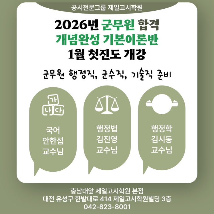 대전공무원학원 2026년 군무원 합격 개념완성 기본이론반 1월 첫진도 개강 제일고시학원 군무원 행정직, 군수직, 기술직 준비