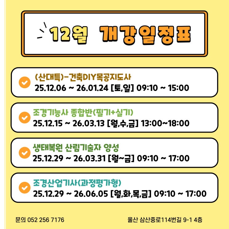 안녕하세요. 미래직업기술학원입니다. 2025년이 지나가고 마무리하는 12월이 다가왔습니다. 시간이 너무 빨리 흘러가는 듯합니다. 저희 학원도 12월이 다가오면서 개강 예정인 훈련과정을 올렸습니다. 참고 바라며, 문의사항은 학원으로 연락 주시기 바랍니다. 또한, 2026년이 시작되면서 신설 과정도 생겼습니다. 특히 목공으로는 건축목공기능사 자격증반과 CNC를 활용한 목공 지그 과정도 준비하고 있습니다 ㅎㅎ 산림기능사필기반과 종자기능사반도 새로 신설되어 개강 예정을 정하고 있습니다. 대략 2회차 시험 때부터 열 예정입니다. 그 외에도 다양한 과정들을 2026년 동안 개강할 예정이며, 관련 정보는 블로그 또는 고용 24 또는 홈페이....... <img src="https://blogthumb.pstatic.net/MjAyNTExMjZfMTc2/MDAxNzY0MTM1NjA0NDE5.DAOicoiR10Ar_Dxc4KvP1wvR0sVHBpbPpeHvTJ-M9dkg.-5xC7XyVeNsYJ4tc4fFLJS3iECgmDe3P8AT7m8wYmPYg.JPEG/001.jpg?type=s3" />