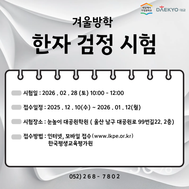 안녕하세요. 눈높이 대공원학원입니다. 벌써 2025년 마지막을 향해 달려가고 있네요. 한자검정시험 접수일도 다가와 함께 안내드리려 합니다. 일정 잘 체크하셔, 준비 잘 할 수 있도록 도와주세요 한자접수 방법도 잘 체크해주세요~~ 지역선택에선 '울산 남구' 그리고 대공원러닝센터 선택도 꼭꼭 !! 해주길 바랍니다. 그리고 추천인란에 '한주희' 010 7565 5131 넣어주세요 합격증을 찾을 때 편하답니다. *** 등급별 합격 기준 *** 눈높이 한자 프로그램 상용한자 1,800자 습득을 통하여 어휘력 및 한문 독해력 완성 주 1회 37,000원 재미있는 스토리와 다양한 부교재로 놀이하는 한자 프로그램 (유아) 주1회 36,000원 <img src="https://blogthumb.pstatic.net/MjAyNTEyMTJfMjc1/MDAxNzY1NTI1NTA4Mjg1.Jo_HPm1DVS9Bah2KG69yvBmEOzlieYAZ_3nROKVOwEAg.uYL15MZBmrH-yGcE79tz2Rx6MI1Z0Tvs4r_XfQW5u4sg.PNG/%C1%A6%B8%F1%C0%BB_%C0%D4%B7%C2%C7%D8%C1%D6%BC%BC%BF%E4.png?type=s3" />
