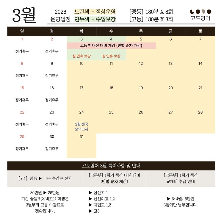 안녕하세요. [고도영어]입니다. [3월] 운영일정 안내드립니다. 중등부 180분 X 8회, 고등부 180분 X 8회 수업을 진행합니다. 사진 하단의 <주요 공지사항>도 꼭 읽어주세요 <주요 공지사항> 1️⃣ 내신 대비 정규 수업 개강 3/3(화) 부터 반별 순차 개강 <2026 내신 대비 고교> 삼산고1 신선여고 1,2 대현고 1,2 고3 2️⃣ 예비고1 수강료 전환 안내 3월부터 기존 중등H(예비고1) 학생들은 3월부터 중등 → 고등 수강료로 전환됩니다. 기존: 30만원 (중등 과정) ✅ 변경: 35만원 (고등 과정) 3️⃣ 고등부 1학기 내신 교재비 안내 3~4월: 5만원 (3월 납부) 5~6월: 5만원 (5월 납부) 그동안 고등부 내신 교재를 별....... <img src="https://blogthumb.pstatic.net/MjAyNjAyMjZfMjQy/MDAxNzcyMTA5MTE5NDMw.KZvEsZedcJlp4MiqeoehbgXS3N23ypW3YDa7MvJFn2og.iOGyoTi0EiTpAmCqfhvcVQyGiGfq7_LOIZ93HdnRAFcg.JPEG/2026-%BF%EE%BF%B5%C0%CF%C1%A4-003.jpg?type=s3" />