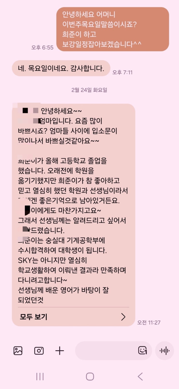 벌써 10년전 제가 서판교 낙원중학교옆에서 작은 영어학원으로 시작하여 수내동으로 확장하기까지 우리 판교 어머님들과 친구들덕분이고 덕분입니다. 며칠전 꽃다발을 들고 그 예쁜미소와 편지로 5년만에 인사와준 연우도 우리 *준이도 이렇게 잘 성장해준 것만으로 너무너무 감사한데 이 아름다운 순간에 그 감동을 함께 나눠주셔서 전 참 복받은 선생입니다. 진심으로 감사합니다 #낙원중#서판교영어#수내동영어#수내동중고등영어#구문영어#서술형영작#서현중#수내중#백현중#신백현중 <img src="https://blogthumb.pstatic.net/MjAyNjAyMjRfMjUy/MDAxNzcxOTAwNzk0ODIz.kIBbSrDqrqwDEisHL85e37hJE2Bmg1LHVTS1U1nKP08g.FJUS1KmE6jFSS8cSDwWXpz1anuLEqIzWMEA5XE8we4gg.JPEG/900%A3%DF1771900794415.jpg?type=s3" />