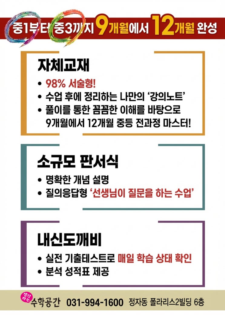"단순히 문제만 많이 푸는 수학에 지친 아이들, 혹시 고민이신가요? 분당에서 아이들이 스스로 생각하는 힘을 기르는 곳 생각하는 수학공간 입니다." 1. "생각의 근육을 키우는 98% 서술형 자체교재" 시중 교재와 달리 전 문항의 98%가 서술형으로 구성되어 있습니다. 단순히 답만 맞히는 공부가 아니라, 풀이 과정을 논리적으로 설계하는 습관을 들여 고난도 서술형 문항에 완벽 대비합니다. 꼼꼼한 풀이 이해를 바탕으로 9개월에서 12개월 안에 중등 전 과정을 완벽히 마스터할 수 있습니다. 2. "질문의 주객전도, 선생님이 질문하는 소규모 판서 수업" 아이가 모르는 것을 질문하는 것을 넘어, 선생님이 역으로....... <img src="https://blogthumb.pstatic.net/MjAyNjAyMjVfMTkw/MDAxNzcyMDE2MjY0Mzg1.whsSabfJKLVhiWQMQ_Xbs5CR7G4hxhNeT545uwt2xCYg.biOULquRaqpbaCXqrMyYpuxpyNSAByZYQoGPpoaIkWEg.JPEG/KakaoTalk_20260225_192651931.jpg?type=s3" />
