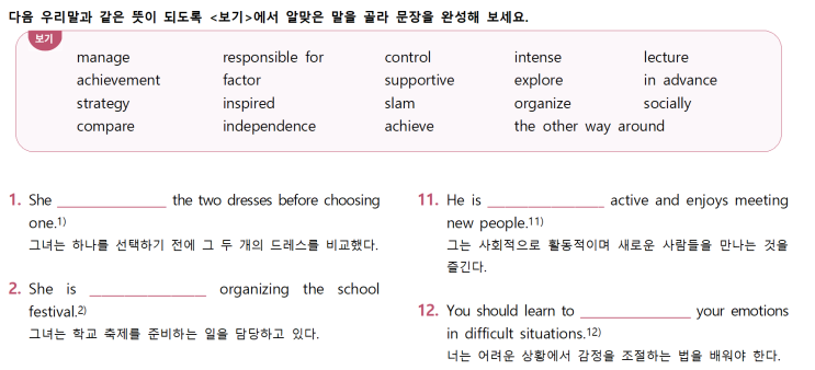 수업 방향 및 목표 본 수업은 고등학교 "국어 내신 대비를 최우선 목표"로 하여 각 학교별 (덕이고, 가좌고, 대진고, 중산고, 경기예고, 고양예고) 출제 경향에 맞추어 교과서, 부교재, 프린트 집중 분석을 통해 점수로 연결되는 실력 향상을 목표로 합니다. "영역별 중점 학습 내용" 수업 내용 < 학기 중 / 학교별 반 편성 > 학교 진도에 맞추어 중간, 기말고사를 준비합니다. 작품(지문) 내용 분석 설명 수업 내용 확인 기초 문제 풀이 기출 문제 풀이 – 족보닷컴, 세모국어 등 유료 문제 사이트 구매, 활용 중 학교별 기출 문제 풀이 (22개정에 맞춘 작년 출제 문제 풀이) 출제 예상 문제 풀이 – 시험직전 보충 수.......