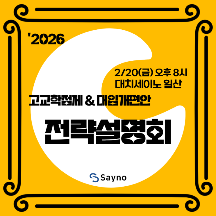 설명회 일정 안내 일시 : 2026. 2. 20(금) 오후 8시 장소 : 경기도 고양시 일산서구 일산로 540, 3층 대치메이드 고등관 대강의실 대상 : 중, 고등학생 및 학부모님 주제 : 고교학점제/대입개편안 대비 전략 설명회 - 고교학점제 고2, 고1, 예비고1 전략 - 대입개편안/통합수능 대비 전략 - 과목 선택 전략 - 학생부 디자인 방법 연사 소개 이상원 입시 소장님 현) 메이드학원 전임 입시 컨설턴트 현) 세이드 입시전략연구소 소장 전) 메가스터디 러셀 입시전략연구소 수석컨설턴트 전) 메가스터디 러셀 대치 N수/고3 최상위권 전문 담당 / 입시 설명회 메인 연사 3년 연속 서울대 의대 합격생 배출 (23학년도, 24학년도, 25학년도) 2025학년도 서....... <img src="https://blogthumb.pstatic.net/MjAyNjAyMDlfMjIz/MDAxNzcwNTY2MzMyNTc0.SzzZQxvfVWL1vizDW35hB7WfJB-dKgDUQ-XmO08igugg.d3Lht9AsTd2c7_zFVDjvLxwZi7pxxME5qXGXzOjID1Qg.PNG/%C1%A6%B8%F1%C0%BB_%C0%D4%B7%C2%C7%D8%C1%D6%BC%BC%BF%E4._%284%29.png?type=s3" />