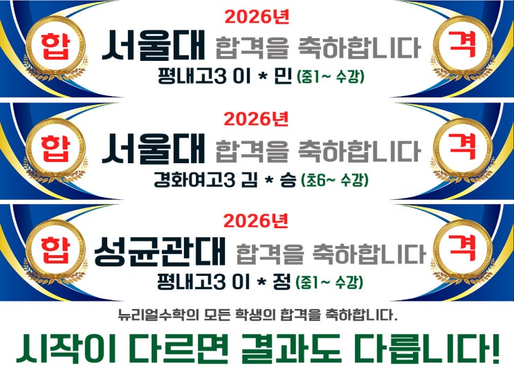 2026년 해피뉴리얼 합격을 축하합니다~ 이번에 합격한 친구들은 뉴리얼수학 오픈 초창기에 막내반부터 시작해 함께 공부해 온 친구들 입니다^^ 문득 4년전 크리스마스를 맞이해서 함께 트리를 장식 했던 사진을 보니 그 의미가 더 남다른 듯 합니다~ 처음 만났을땐 힘들고 어렵게만 느껴졌던 수학이 어느순간 재밌게 공부할 수 있다는 걸 배우게 되었고, 그렇게 쌤들과 한걸음 한걸음 함께 발맞춰 걸어가며 성취감과 자신감으로 어느새 꿈을 가지게 되었습니다 뉴리얼수학의 목적은 하나입니다. “너희가 목표를 향해 걸어갈때 적어도 수학이 발목잡지 않게 해주겠다” 이 약속 하나를 지키기 위해 최선을 다했고 우리 학생들도 선생님들을 믿고....... <img src="https://blogthumb.pstatic.net/MjAyNTEyMjJfMTE3/MDAxNzY2MzgwOTA3NzM1.IvpI9oM-uLioerHP8GBD8R7eMV_3HoF4IWtaxohDSl0g.Up2_QC4VU-ugD39UrhYVJ3bdtVBVl1uXdrl2t7F2NHMg.JPEG/%C7%D5%B0%DD%C0%DA_%C7%F6%BC%F6%B8%B7.jpg?type=s3" />