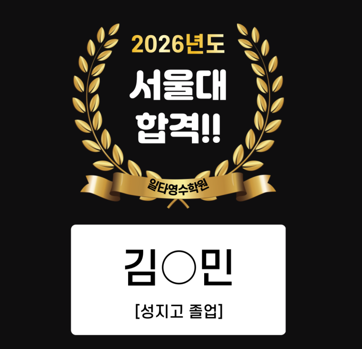 일타수학학원 강남대점에서 4년을 함께한 고3 김O민 학생, 서울대 자유전공학부 최종 합격을 진심으로 축하합니다! 일타수학학원에서 매우 기쁜 소식을 전합니다. 중3~고3까지 4년간 재원했던 김O민 학생이 서울대 자유전공학부에 최종 합격했습니다. 성지고에서 전과목 내신평점 1.0으로 최종 마무리를 하면서 서울대를 비롯한 함께 원서를 쓴 여타 명문대들 또한 복수 합격을 했습니다. 처음 중3때 수업을 할 때는 성취도가 우수해서 중등과정에서는 할 것이 없어서 따로 고등과정으로 수업을 빼서 진행했었습니다. 중3 때 이미 미적분 자이스토리를 풀면서 그 나이에도 킬러문제를 접근해서 답을 내는 것을 보고 감탄했던 기억이 아직도 생생....... <img src="https://blogthumb.pstatic.net/MjAyNTEyMTRfMTc4/MDAxNzY1NjgzNDczMDcx.4DZfpflcjvIAeRHf3dc_ujBi7dtWoeP1D1kovaVQnnMg.GTfvZV1Au7bTsvVIW2WnCXSaQeKIo5AQklsbe5T5_G0g.PNG/%BC%AD%BF%EF%B4%EB_%C7%D5%B0%DD.png?type=s3" />