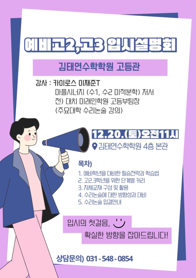 지난 설명회 성원에 힘 입어 예비 고2, 고3 학생들을 위한 입시 설명회를 개최합니다. 이번 설명회에서는 예비 고2, 고3 학생들을 위한 입시 방향과 학습전략을 한눈에 보실 수 있도록 준비하였습니다. 교육 과정 분석부터 단계별 학습 전략까지, 올바른 공부 방향을 찾을 수 있도록 함께하겠습니다. 설명회는 예약제로 진행되며, 사전 예약 시 개별 상담도 가능하니 여러분의 많은 관심과 참여를 기다립니다. 장소: 김태연 수학학원 4층, 본관 일시: 12월 20일(토) 오전 11시 031-548-0854 <img src="https://blogthumb.pstatic.net/MjAyNTEyMTZfMzQg/MDAxNzY1ODI1ODI0NTA4.2jsFsyFho4-KsRMI7apwl2MSNupjqICtX4M1nrrZky4g.yUOzcom4zBl482tU-p0lMxuTTO11FZI_7axOON7JdzMg.JPEG/IMG%A3%DF6819.jpg?type=s3" />