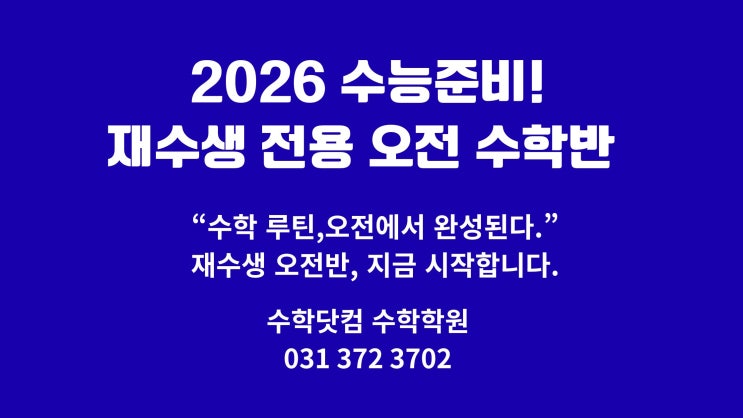 재수생을 위한 오전 집중 수학반 OPEN 재수생활에서 가장 어려운 점은 리듬을 만드는 것입니다. 밤에는 집중이 안되고,오전 시간은 허무하게 흘러가고... 그렇게 하루 패턴이 흔들리면,결국 성적도 멈춰버립니다. 그래서 준비했습니다. 재수생 전용'오전 집중 수학반'을 새롭게 개설합니다. 어떤 수업인가요? 재수생·반수생 맞춤 커리큘럽 아침부터 강제 집중 환경 제공 소수정예→개별 약점 분석 후 맞춤 보완 매 수업 테스트로 개념·유형 완전 정리 오답관리+누적 약점 체크 공부 루틴 무너진 학생을 위한 관리형 시스템 아침을 잡는 순간,하루의 효율이 달라집니다. 오전 시간을 제대로 쓰는 재수생이 수능을 잡습니다. 이런 학생에....... <img src="https://blogthumb.pstatic.net/MjAyNTEyMTFfMjI1/MDAxNzY1NDY0MjcwMDY2.7IFIq-RZzOVvG4Z5rbW58qotdTJVvQbMb5qYWskt1c0g.0fCOkNJasDSKjFdn3E6Es1_T8JuToTca2_JB0i_BiqUg.JPEG/2026_%BC%F6%B4%C9%C1%D8%BA%F1_%C0%E7%BC%F6%BB%FD_%C0%FC%BF%EB_%BF%C0%C0%FC_%BC%F6%C7%D0%B9%DD.jpg?type=s3" />