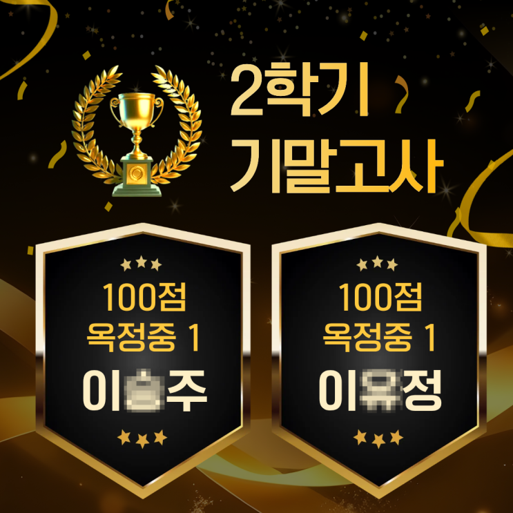 2023년 8월 오픈한 이래로 지금까지 꾸준하게 공부해준 중학교 1학년 학생 2명이 이번 기말고사에서 100점을 맞았습니다. 정말 진심으로 축하합니다.^^ 선생님이 지시한 내용을 모두 성실하게 이행해주고 잘 따라와주어 좋은 성적을 받을 수 있었습니다. 앞으로도 저희 삼성영어셀레나 커리큘럼으로 즐거운 영어 여정이 되었으면 좋겠습니다. #삼성영어셀레나옥정호수초학원 #옥정호수초영어학원 #옥정제일풍경채영어학원 #옥정제일풍경채영어공부방 #옥정영어학원 <img src="https://blogthumb.pstatic.net/MjAyNTEyMThfMjc5/MDAxNzY2MDM0Mzk0MzM2.VB_cm7pr89F-eP7n6CNxmwPh8MZ_90p8B7weRoQnIJ4g.T35c1OcS1kGDubmjjvlp4pSu4yLtb3wsT7ZoDSR-xzgg.PNG/900%A3%DF1766033349201.png?type=s3" />