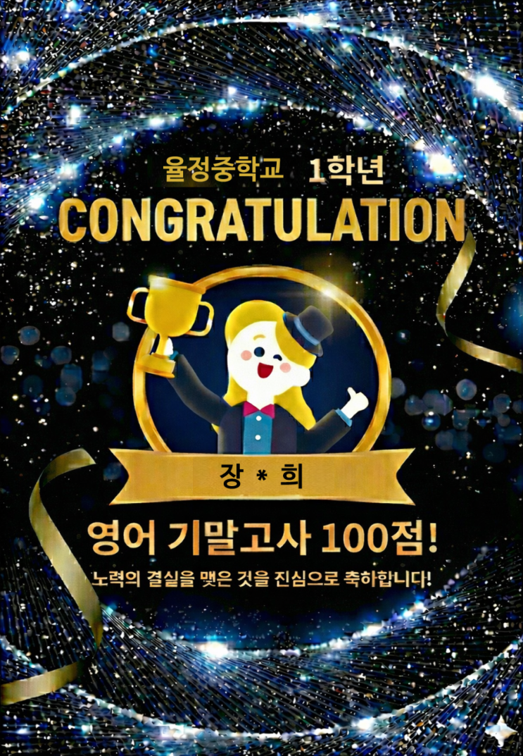 율정중학교 기말고사 중1 2명 100점 축하합니다!