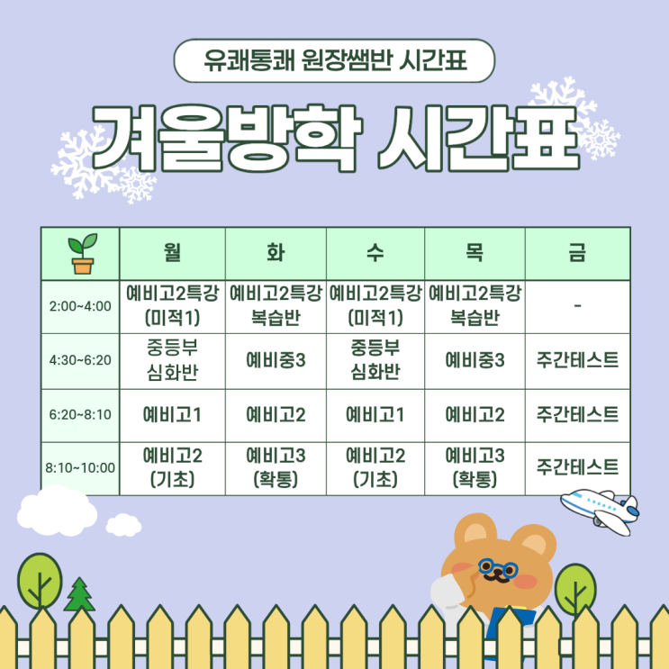안녕하세요? 원수학 학원입니다. 한 해의 마지막 시험이 끝나고 어느덧 겨울방학을 앞두고 있습니다. 겨울방학은 아이들이 한 해 동안 열심히 달려온 만큼 잠시 체력을 보충하고 가족이나 친구들과 즐거운 추억을 쌓는 시간이기도 하지만, 상급 학년으로의 진학을 준비하는 매우 중요한 시기이기도 합니다. 원수학 학원에서는 아이들이 상급 학년으로 진학하여 학교 수업을 더 잘 이해하고 실력을 쌓을 수 있도록 돕기 위해 방학에는 정규 수업과 함께 특강 프로그램을 진행할 예정입니다. <원수학 학원만의 방학 시간표>를 안내 합니다. 아래의 시간표들은 ”1월부터 진행“ 됩니다. 편쌤 반의 초등부에 대한 추가적인 설명입니다. 많은 관....... <img src="https://blogthumb.pstatic.net/MjAyNTEyMTlfMTM5/MDAxNzY2MTMyMjkzNDQ4.td-oECRfSLtrXqlRlX1JXEb1A0Gt0gk5e4QPf_MLy3wg.e9zgMcenVgR86fTNSk1No3hcFoCIIBZugA73ERZTBcYg.PNG/%BF%F8%C0%E5%BD%DC_%BD%C3%B0%A3%C7%A5.png?type=s3" />