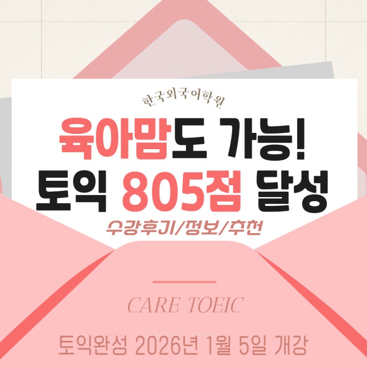 강의명 그대로! 케어받고 육아맘도 목표달성! https://learnersbox.co.kr/article/%EC%83%9D%EC%83%9D%EB%A6%AC%EC%96%BC%ED%9B%84%EA%B8%B0/4/2576/ 육아 휴직중 2026년도 복직을 앞두고 해외지사에서도 근무하고 싶은 마음이 있어 근무지 선택폭을 넓히고자 예전 대학생 시절에도 함께했던 한국외국어학원을 바로 선택하게 되었고, 그 중 윤소현 쌤의 케어토익을 수강신청하게 되었습니다. 무려 13년 만에 다시 시작하는 토익공부였기에 700반, 800반 고민을 했는데 소현쌤께서 800반은 문제감을 빨리 잡을 수 있는 장점이 있다고 하여 복직까지 남은 3개월이라는 제한된 시간내에 목표점수가 나와야 하기에 800+ 목표반을 선택하게 되었습니다....... <img src="https://blogthumb.pstatic.net/MjAyNTEyMThfMTA5/MDAxNzY2MDI5NzEwNDc1.WwVObkkZ73LBPSHW4K3N617yWQtcMMyBUO8ev7lH7zcg.iV4Q2NYd7ue5HjxsEWmvRDgTwkFINx6YtAkci3RN5xog.JPEG/%C1%A6%B8%F1%C0%BB_%C0%D4%B7%C2%C7%CF%BC%BC%BF%E4.jpg?type=s3" />